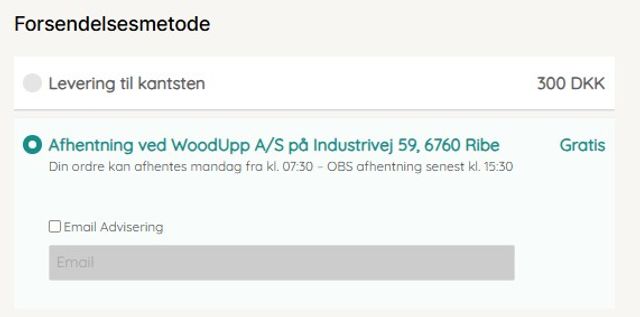 Når du udfylder din adresse ved checkout, vil du have muligheden for at vælge afhentning direkte fra vores adresse, fremfor for levering.